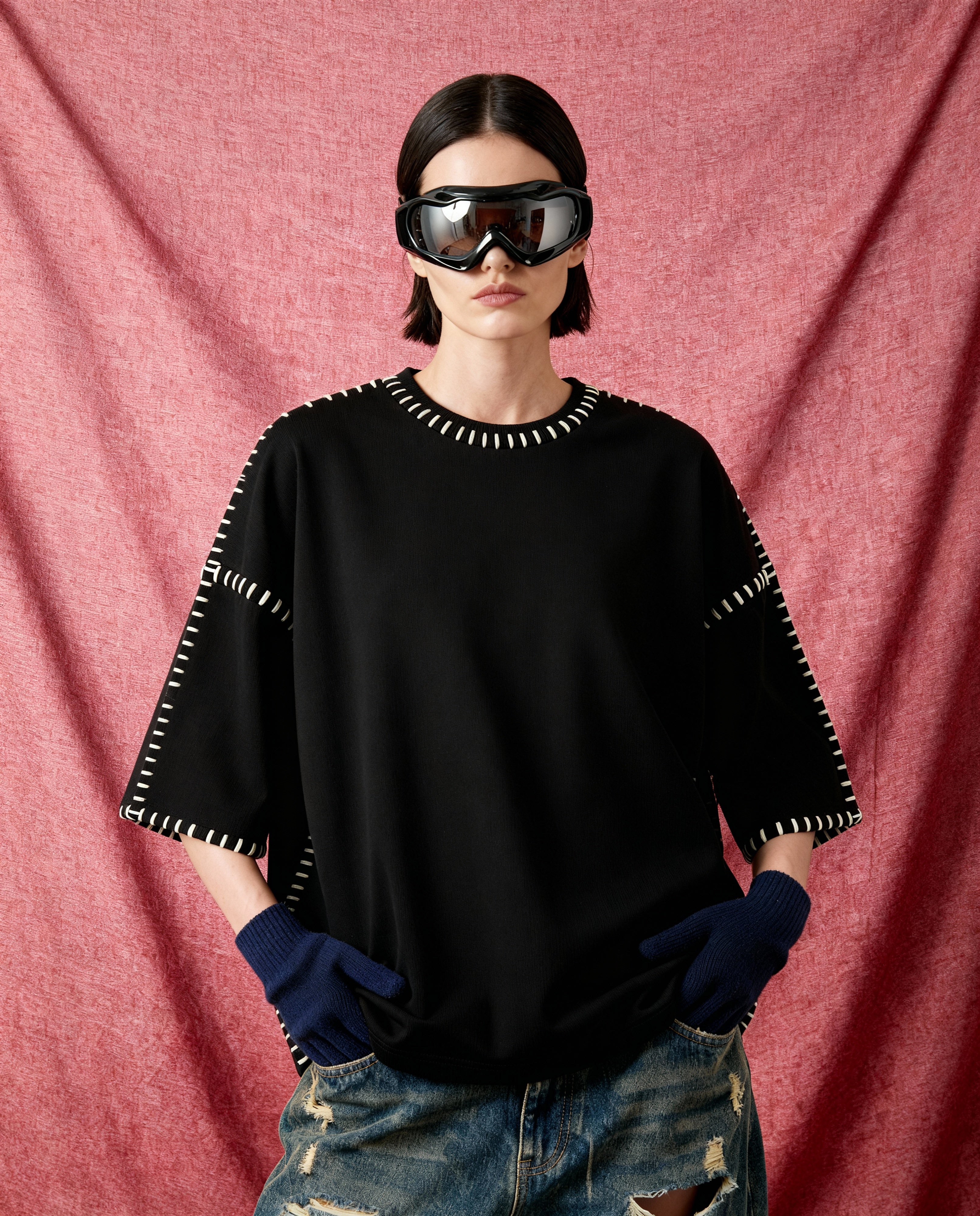 Person wearing a black t-shirt with white trim, sunglasses, and gloves against a red background