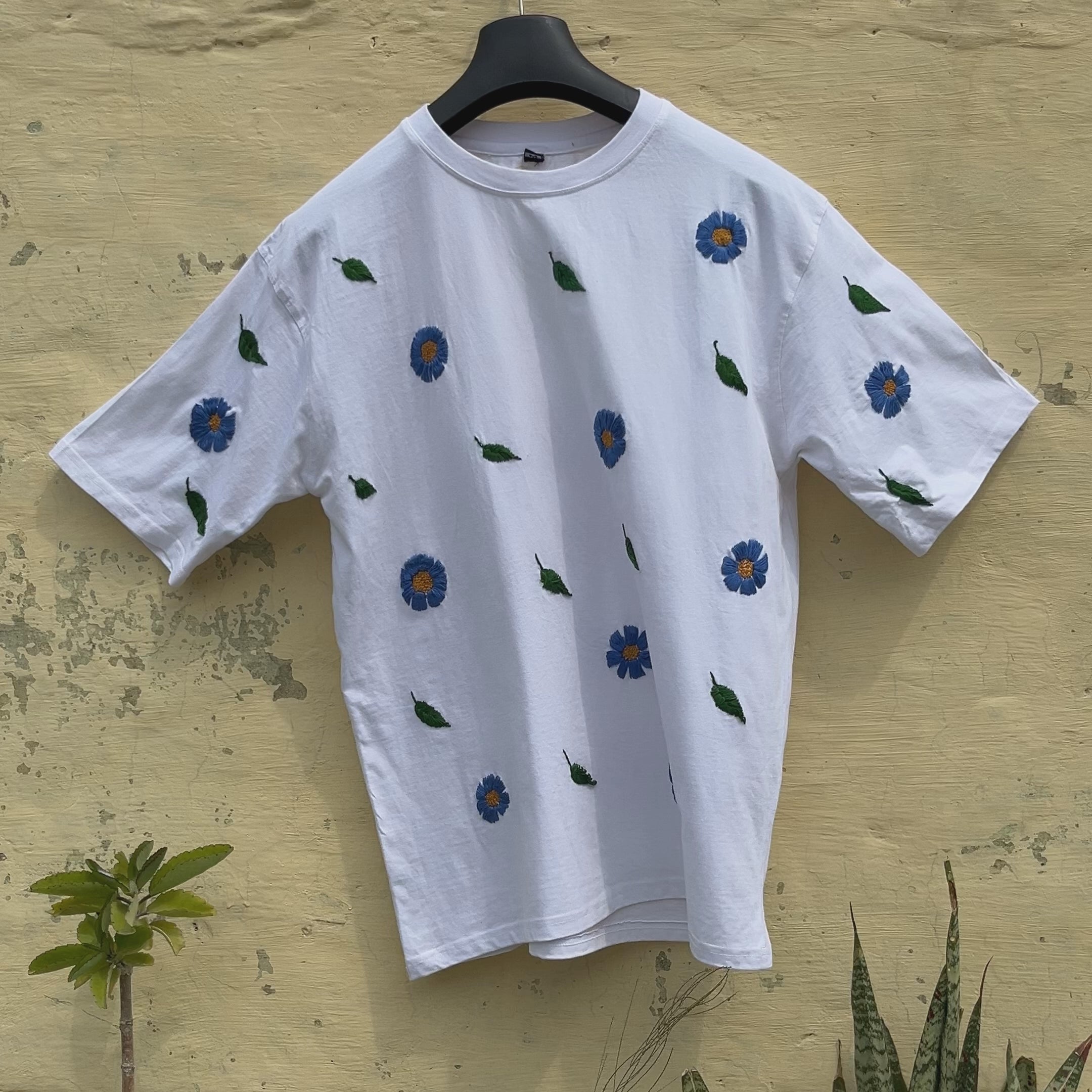 Azure Bloom Hand-Embroidered Oversized Tee (Unisex)